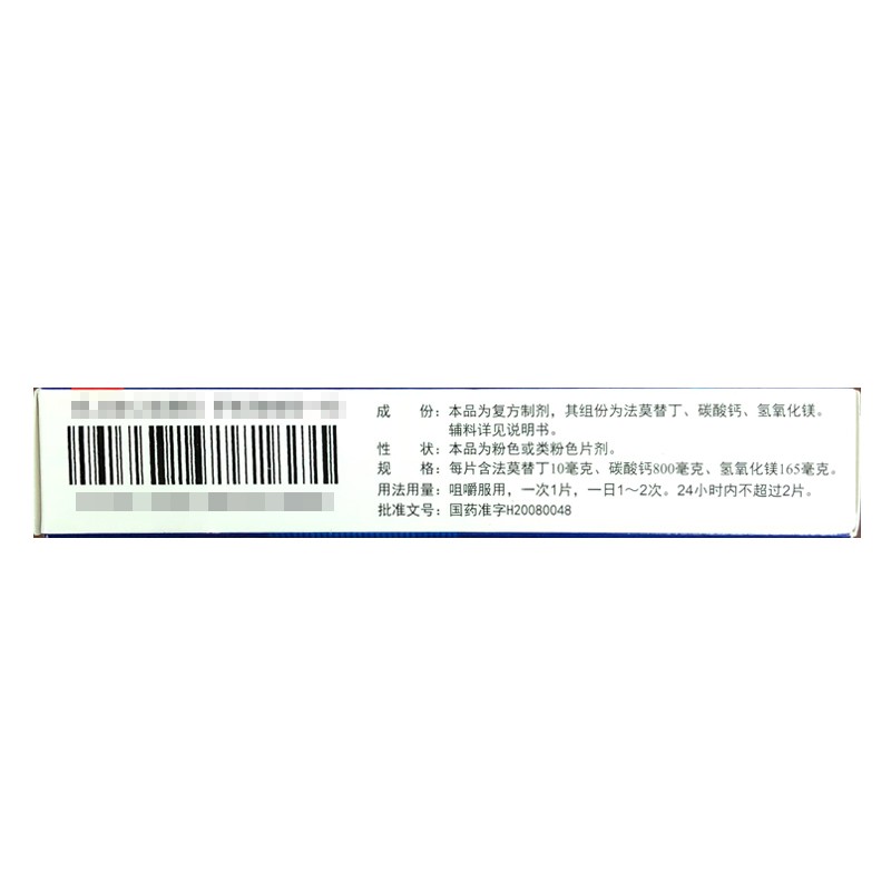 【藥品成份】本品為復方制劑,其組分為:每片含碳酸鈣800mg、氫氧化鎂165mg、法莫替丁10mg。