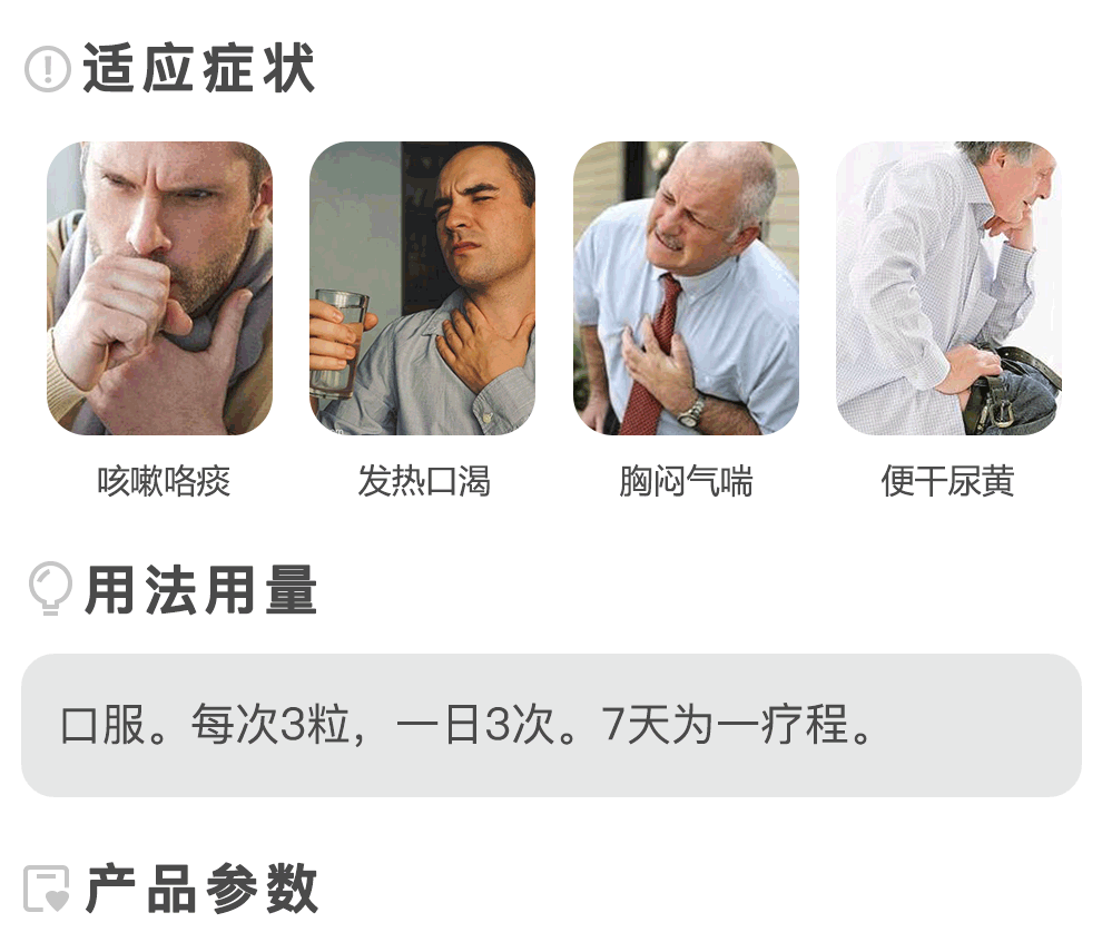 | 用法說明 | 口服,每次3粒,一日3次。7天為一療程。 |