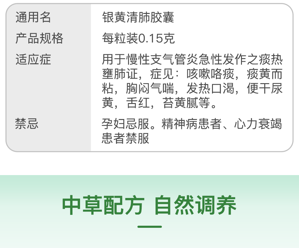 中醫(yī)主要是用來治療痰熱蘊肺所致的咳嗽,咳痰,痰色黃質(zhì)黏,不易咳,舌質(zhì)紅,苔黃膩,脈滑數(shù)等癥狀。西醫(yī)主要是用來治療慢性支氣管炎,阻塞性肺氣腫,支氣管擴張等疾病。在應用銀黃清肺膠囊期間,患者不能吃辛辣刺激性及肥甘厚膩性食品。