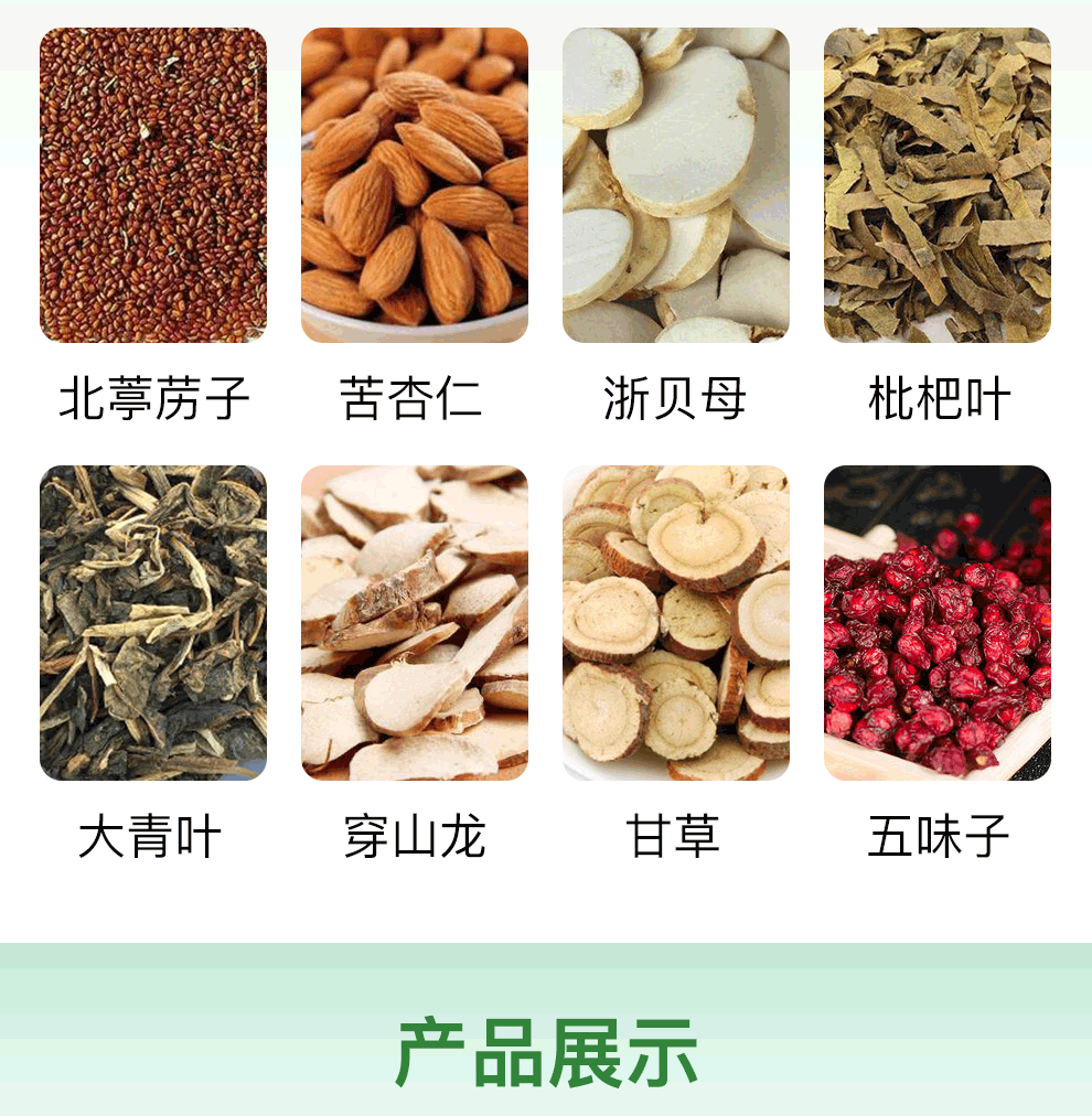 | 成分原料 | 北葶藶子、麻黃、苦杏仁、浙貝母、枇杷葉、大青葉、石菖蒲、穿山龍、一枝蒿、銀杏葉、五味子、枳實、生石膏、甘草。輔料為淀粉、硬脂酸鎂。 |