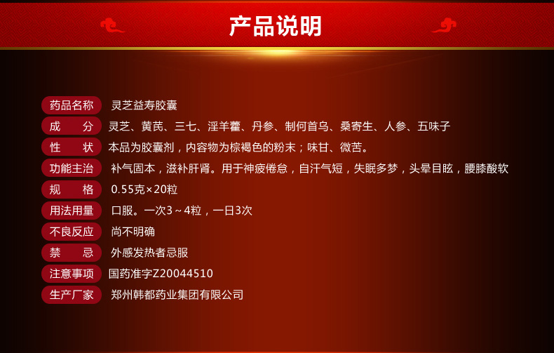 【藥品成份】靈芝、黃芪、三七、淫羊藿、丹參、制何首烏、桑寄生、人參、五味子。
