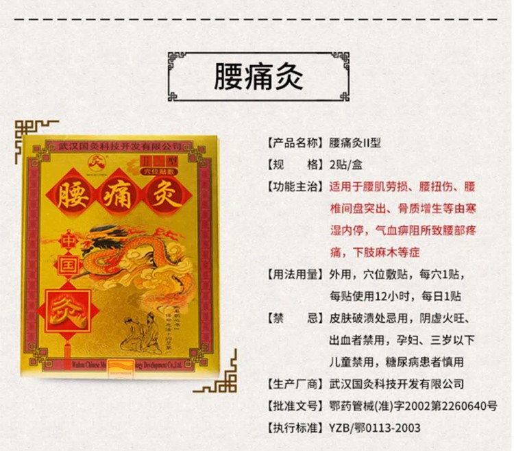 【功能主治】:適用于腰肌勞損、腰扭傷、腰椎間盤突出、骨質(zhì)增生等由寒濕內(nèi)停、氣血痹阻所致腰部疼痛、下肢麻木等癥。