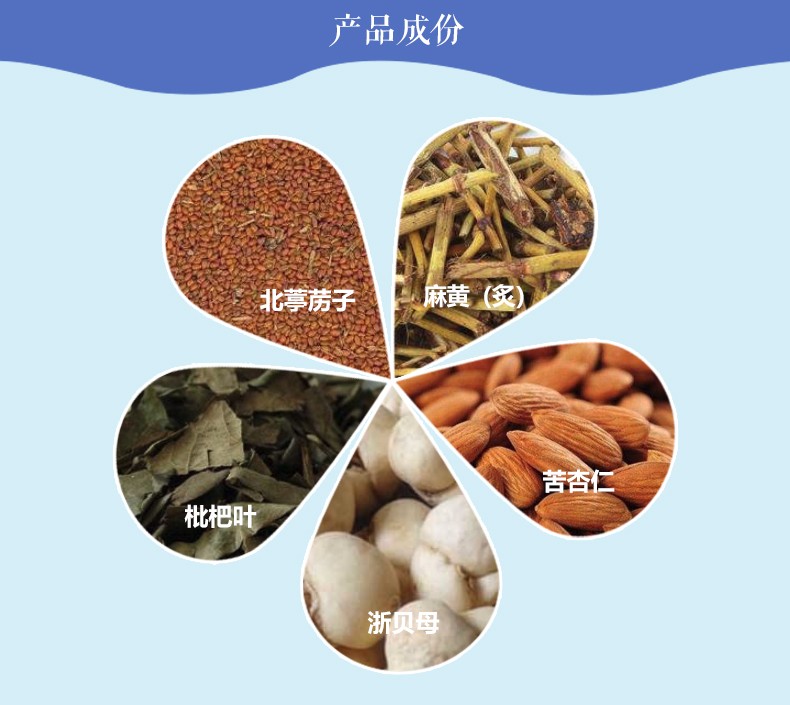 | 成分原料 | 北葶藶子、麻黃、苦杏仁、浙貝母、枇杷葉、大青葉、石菖蒲、穿山龍等。 |