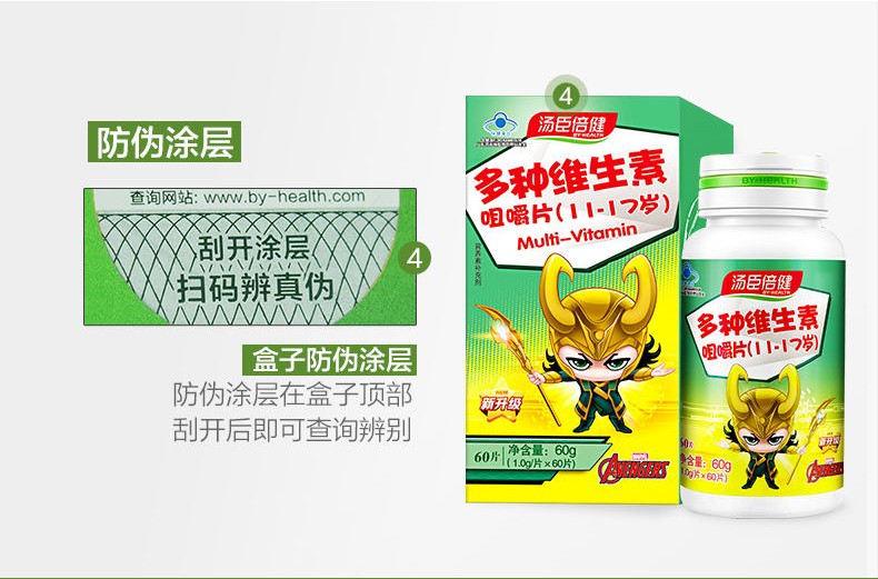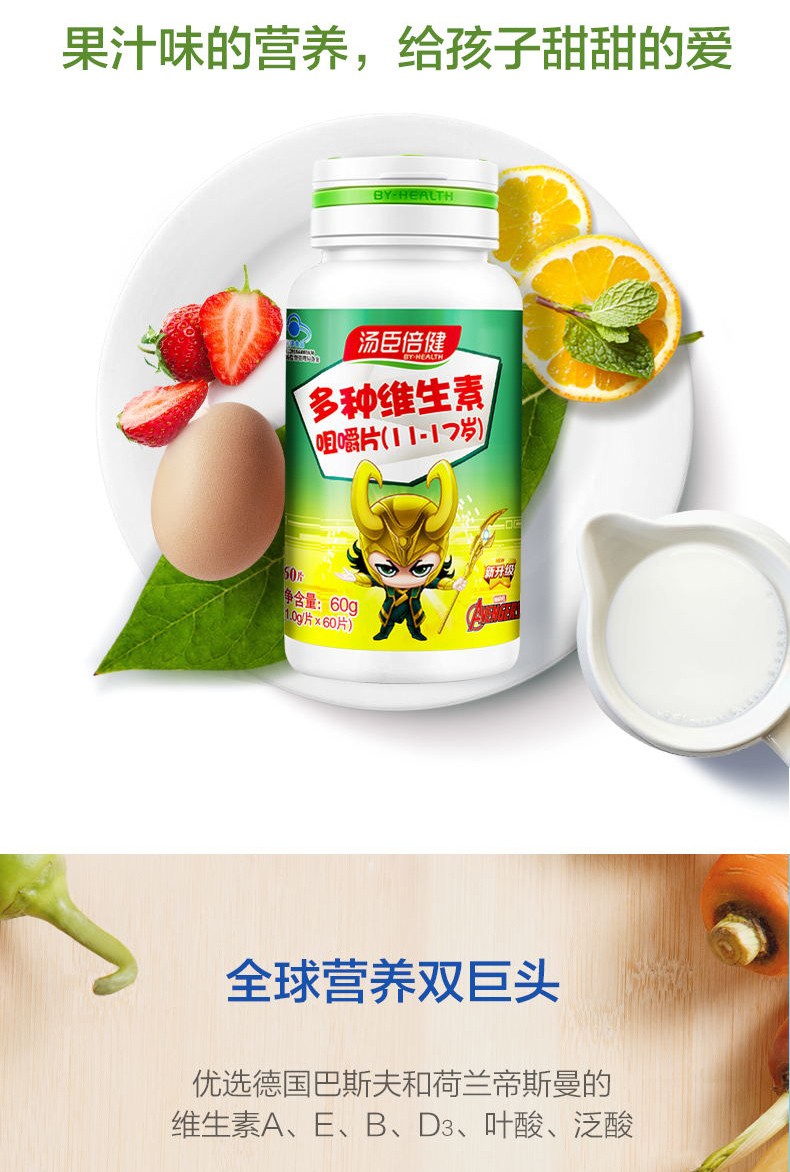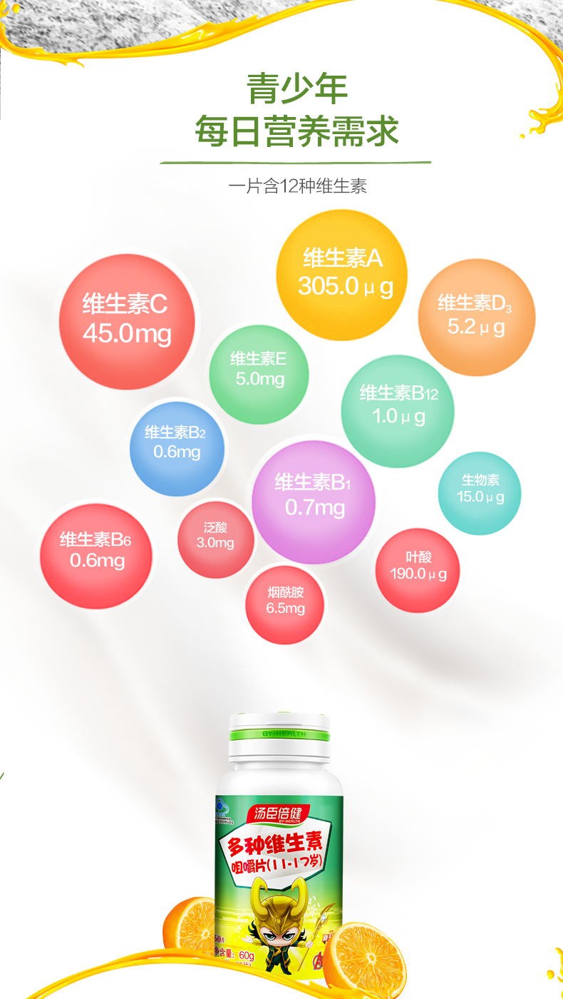 【藥品成份】湯臣倍健多種維生素咀嚼片由維生素c、天然維生素e(d-α-生育酚醋酸酯)、煙酰胺、維生素a醋酸酯、維生素d3、d-泛酸鈣、維生素b12、維生素b1、維生素b2、維生素b6、生物素、葉酸、山梨糖醇、白砂糖組成。