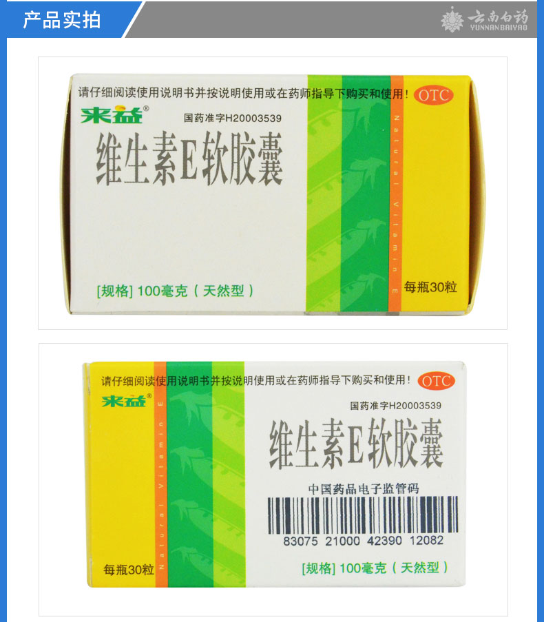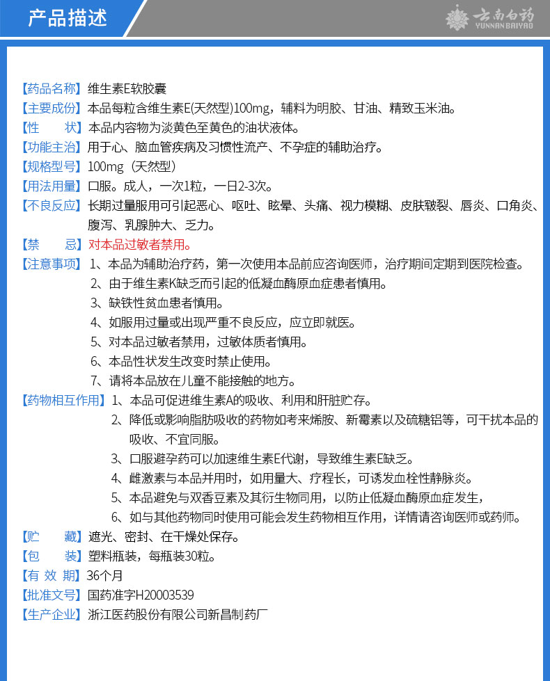本品每粒含主要成份維生素e100毫克。輔料為精制玉米油、明膠、甘油。 |