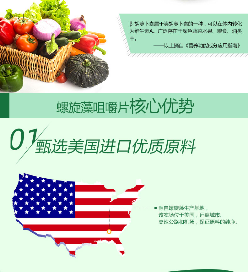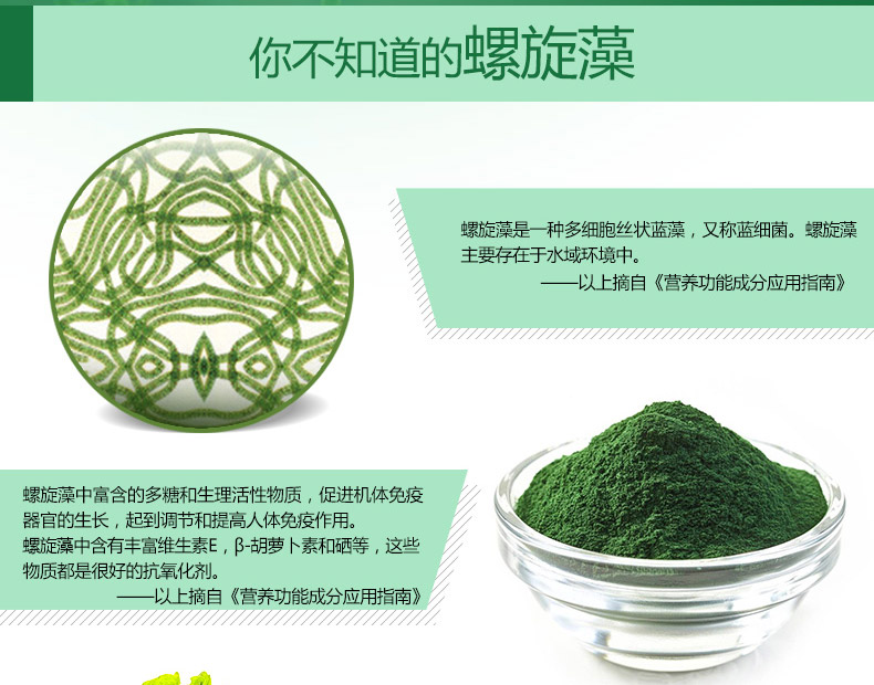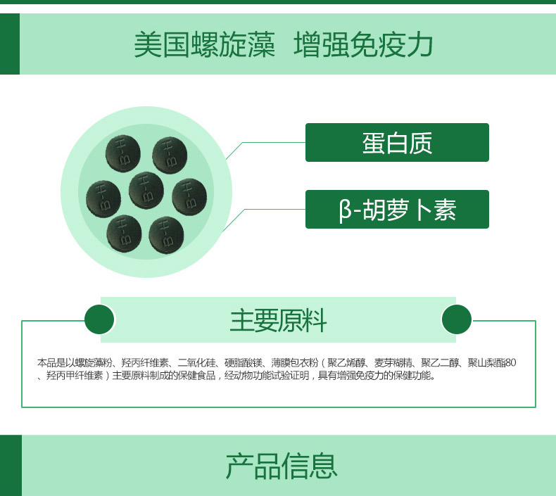 | 成分原料 | 螺旋藻粉 、羥丙纖維素、二氧化硅、硬脂酸鎂、薄膜包衣粉(聚乙烯醇、麥芽糊精、聚乙二醇、聚山梨酯80、羥丙甲纖維素)。 |