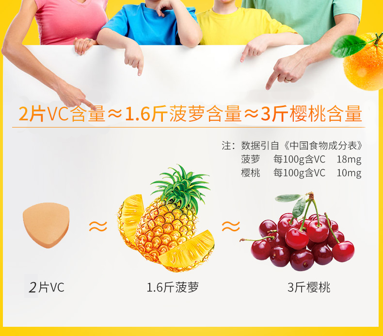【藥品成份】維生素c、甘露醇、葡萄糖、白糖、硬脂酸鎂、檸檬酸、聚乙烯基吡咯烷酮、羥丙甲纖維素、二氧化鈦、滑石粉、胭脂紅、檸檬黃等。