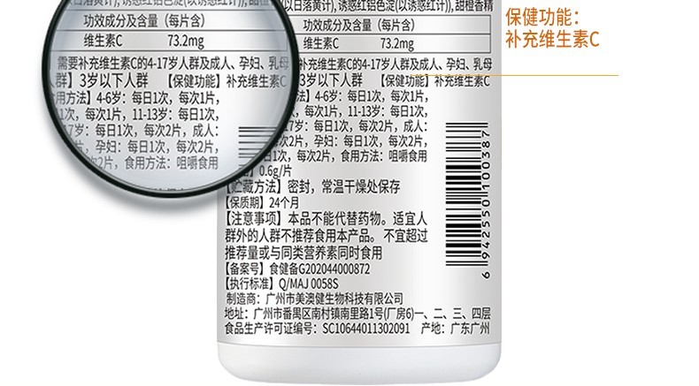 | 成分原料 | 維生素c、甘露醇、葡萄糖、白糖、硬脂酸鎂、檸檬酸、聚乙烯基吡咯烷酮、羥丙甲纖維素、二氧化鈦、滑石粉、胭脂紅、檸檬黃等。 |