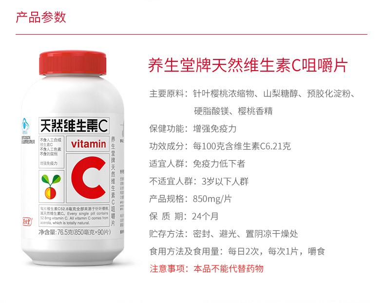 【包裝型號】養(yǎng)生堂天然維生素c咀嚼片,850mg*90s/瓶。