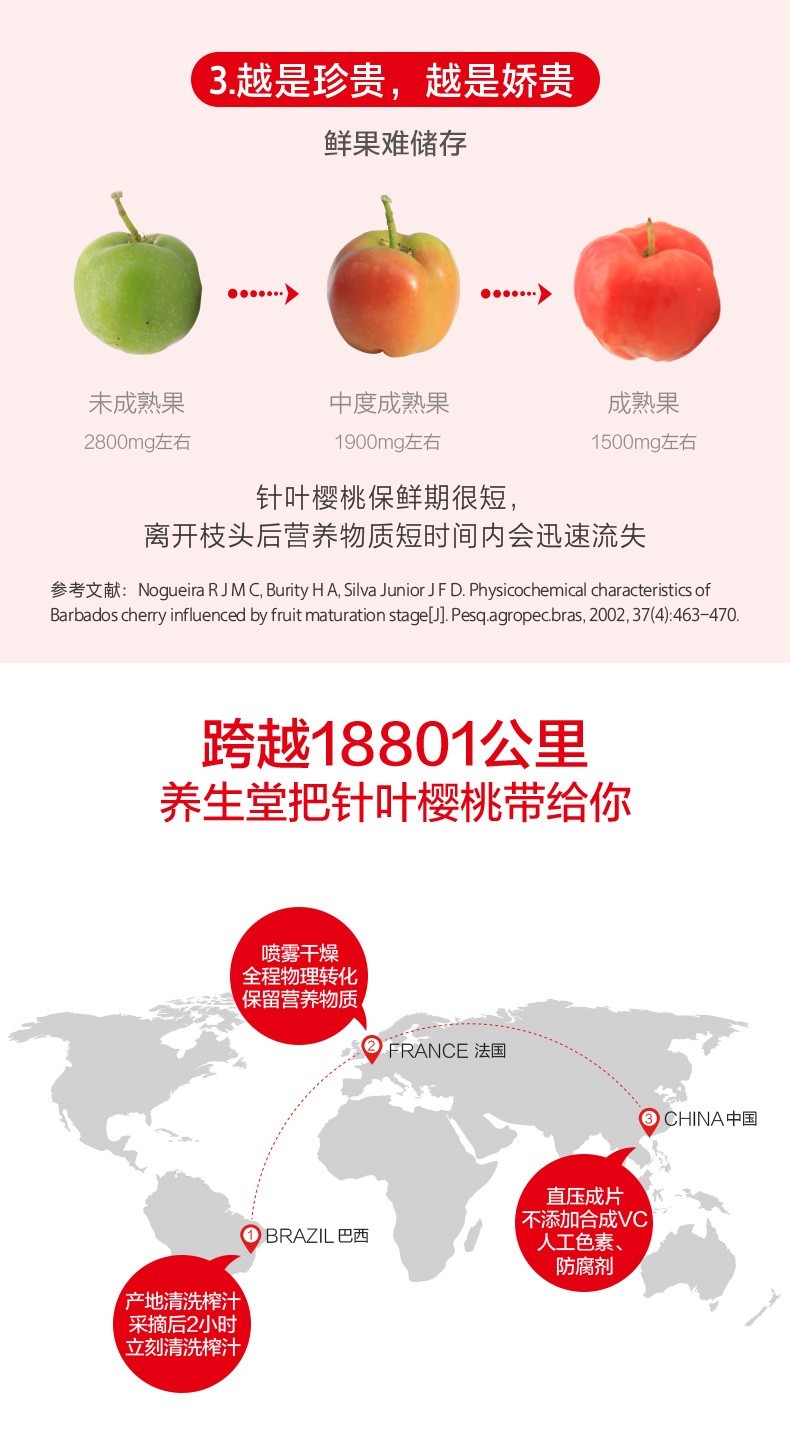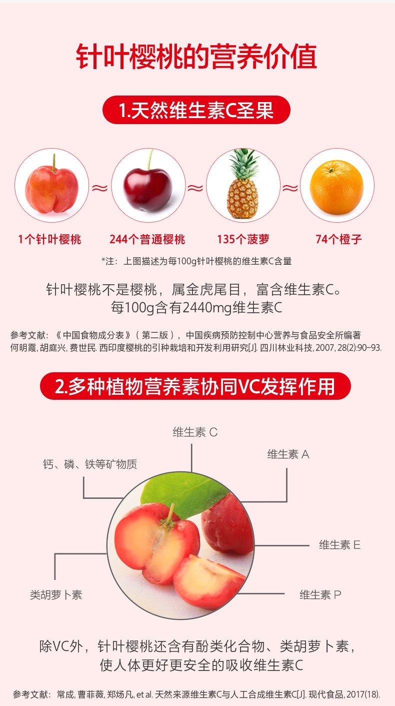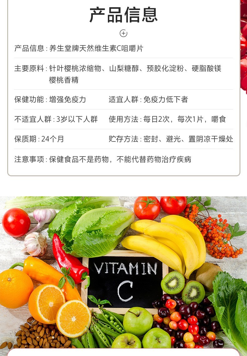 | 成分原料 | 維生素c、針葉櫻桃濃縮物、山梨糖醇、預(yù)膠化淀粉、硬脂酸鎂、櫻桃香精。 |