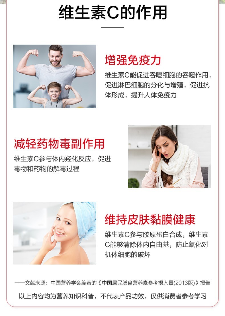 【功能主治】:維生素c補充劑。用于預(yù)防和治療壞血病以及各種急、慢性傳染疾病或其他疾病以增強機體抵抗力,病后恢復(fù)期、創(chuàng)傷愈合期及過敏性疾病的輔助治療。