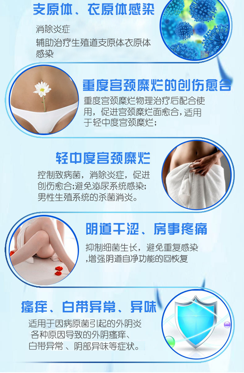 【功能】 該產(chǎn)品適用于細菌性陰道病、滴蟲性陰道炎、念珠菌性陰道炎、老年性陰道炎、陰道混合感染;輔助性治療生殖道支原體衣原體感染;用于輕中度宮頸糜爛的治療及促進重度宮頸糜爛物理治療后的創(chuàng)傷愈合。