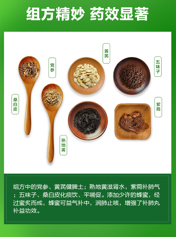 | 成分原料 | 熟地黃、黨參、黃芪(蜜炙)、桑白皮(蜜炙)、紫菀、五味子。輔料為:蜂蜜。 |