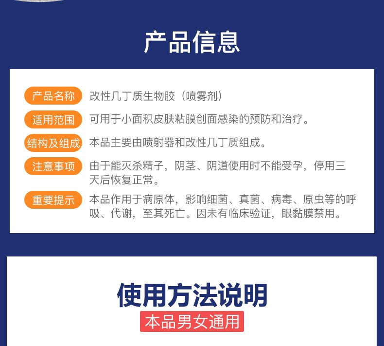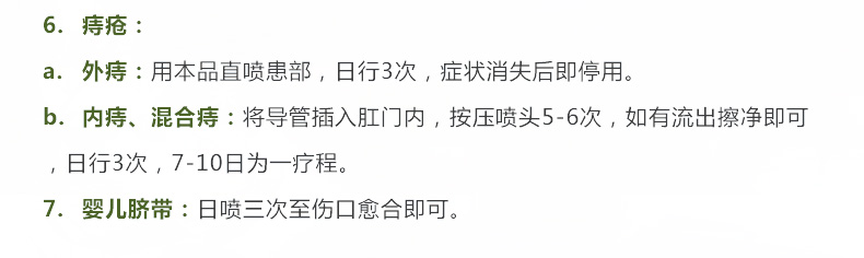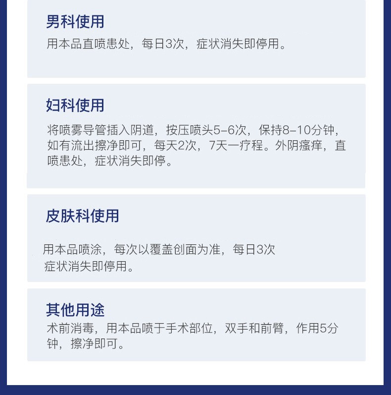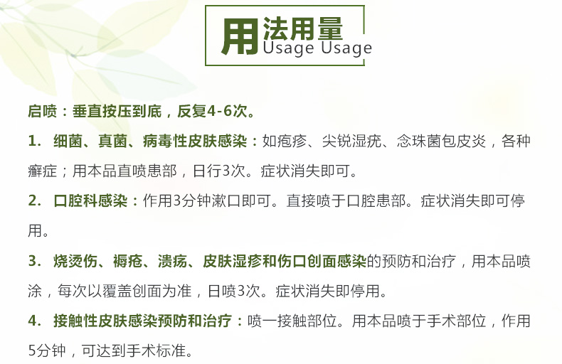 4、接觸性皮膚感染預防和治療:噴于接觸部位。用本品噴于手術部位,作用5分鐘,可達手術標準。(詳見說明書) |