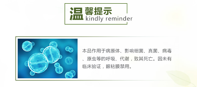 【重要提醒】本品作用于病原體,影響細菌,真菌、病毒、原蟲等的呼吸,代謝,致其死亡。因未有臨床驗證,眼粘膜禁用。