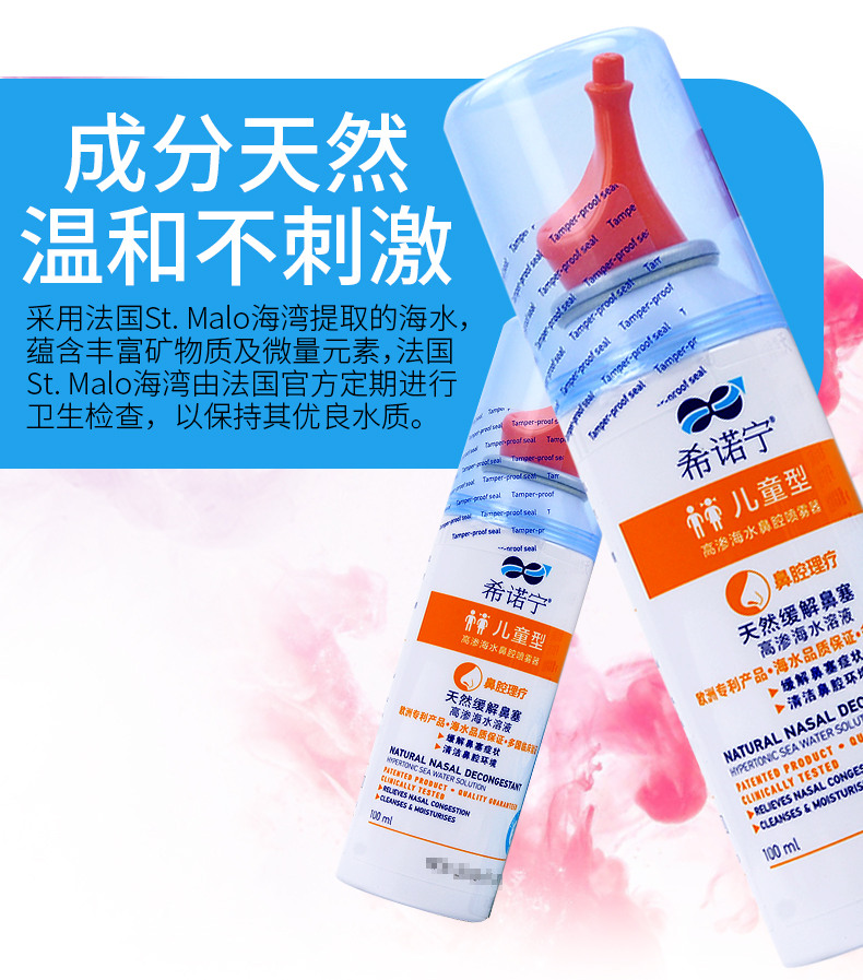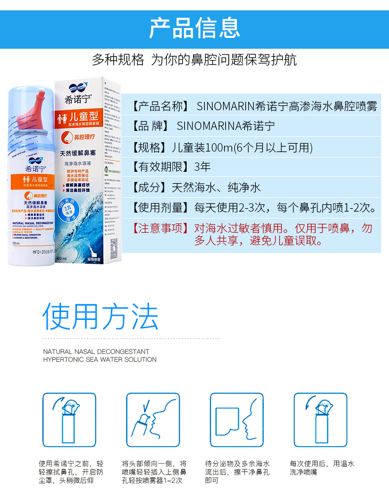 【用法用量】 1.開啟防塵罩,頭稍往后仰,將噴嘴置于鼻孔前,輕按手動泵,生理性海水呈霧狀噴出。 2.每次每側(cè)鼻孔4-8噴。用紙巾擦除鼻分泌物及多余生理性海水。 3.清潔噴嘴,蓋上防塵罩。 4.每天2-6次。