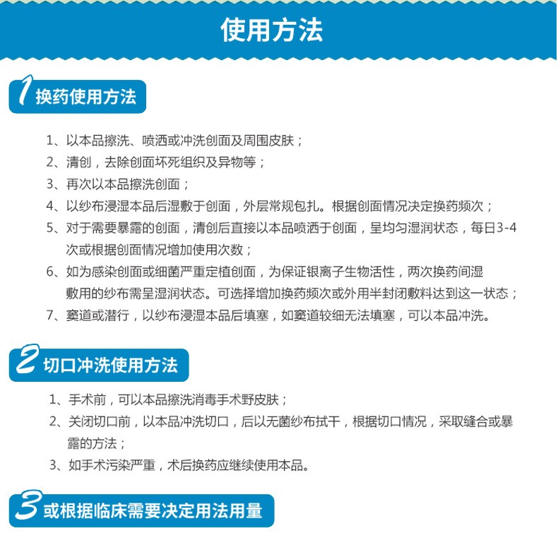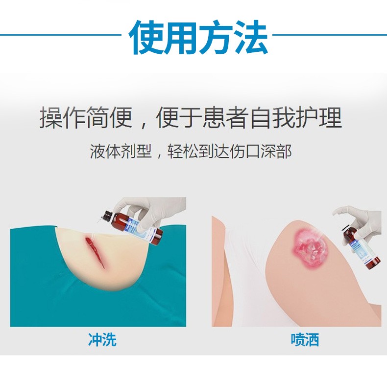 【用法用量】一、換藥使用方法:1.以本品擦洗、噴灑或沖洗創(chuàng)面及周圍皮膚;