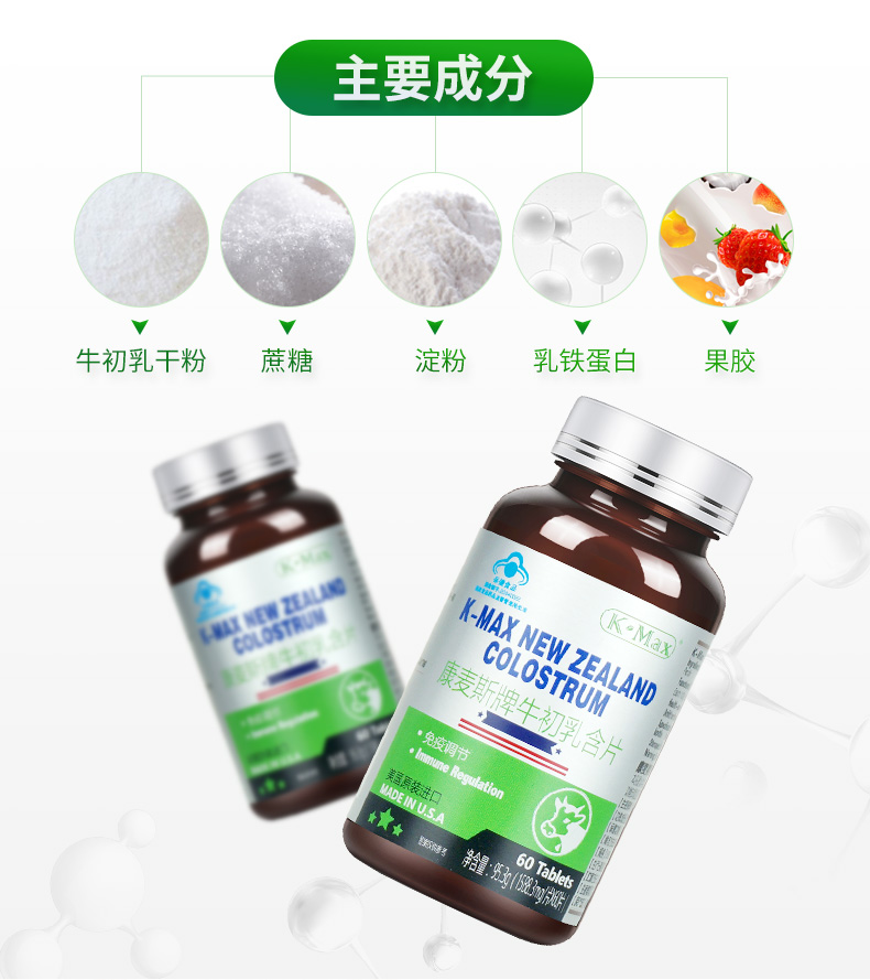 【藥品成份】牛初乳干粉、蔗糖、淀粉、乳鐵蛋白、果膠。